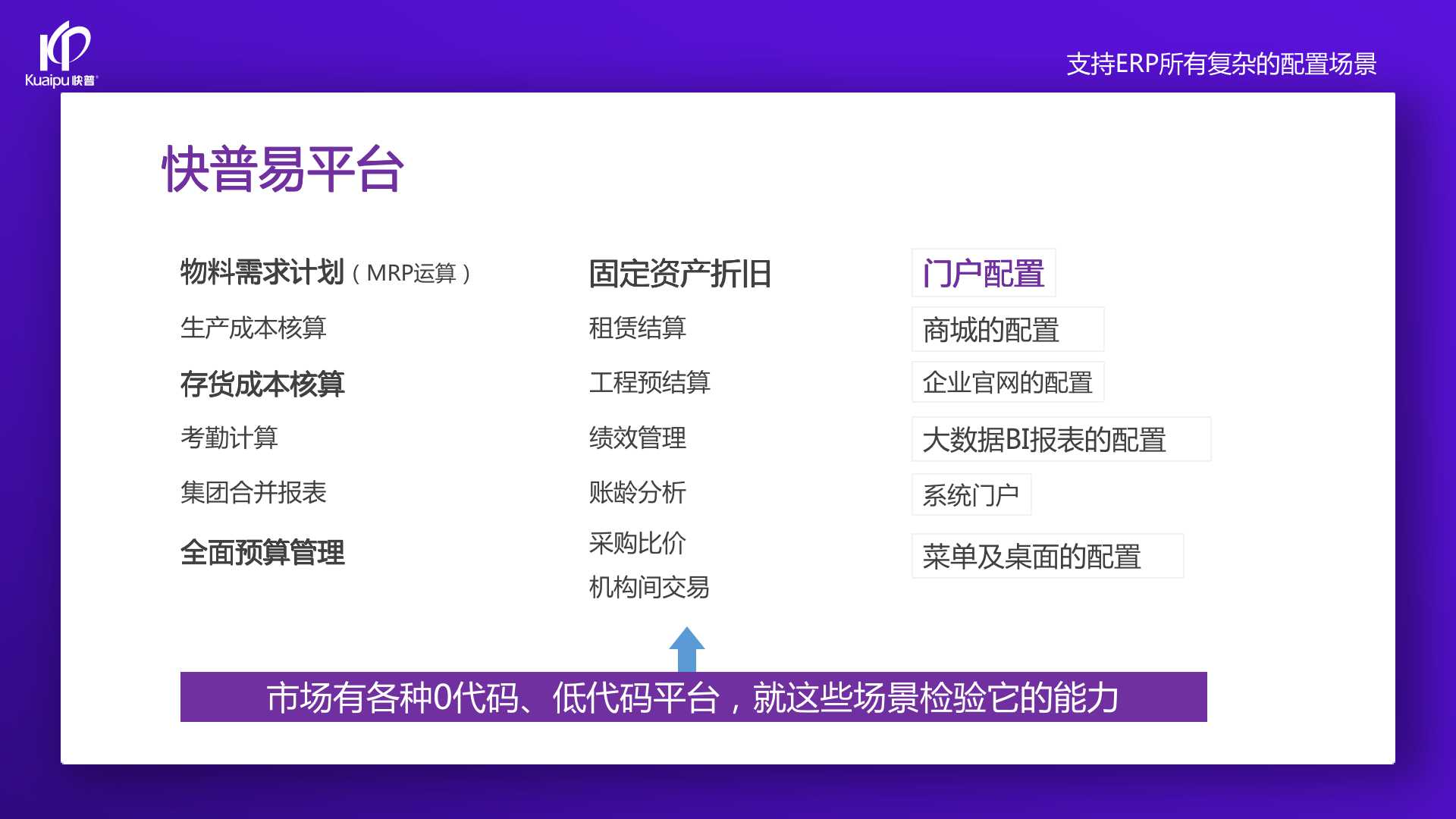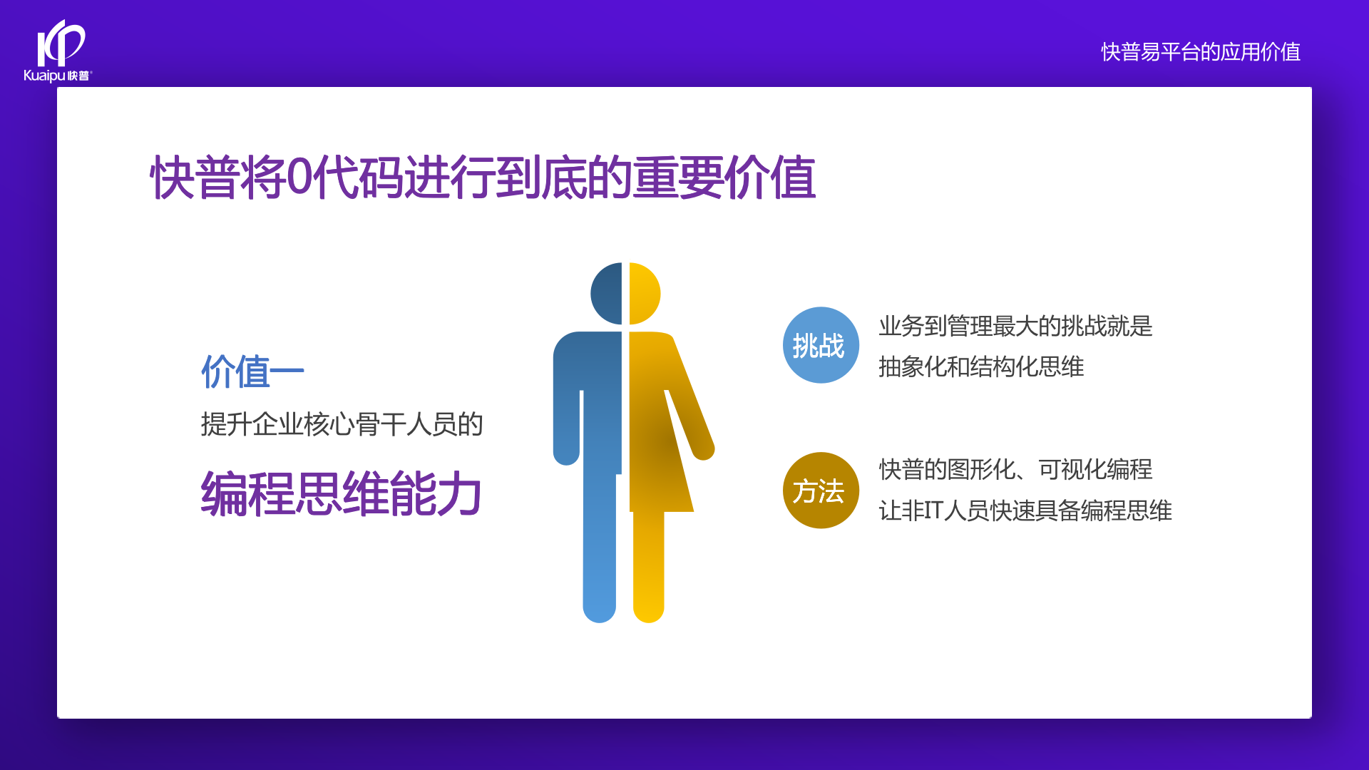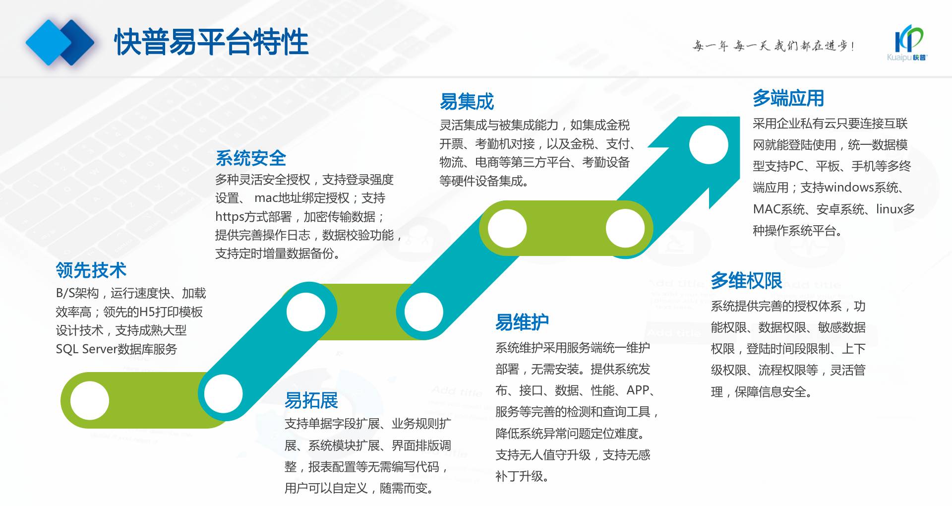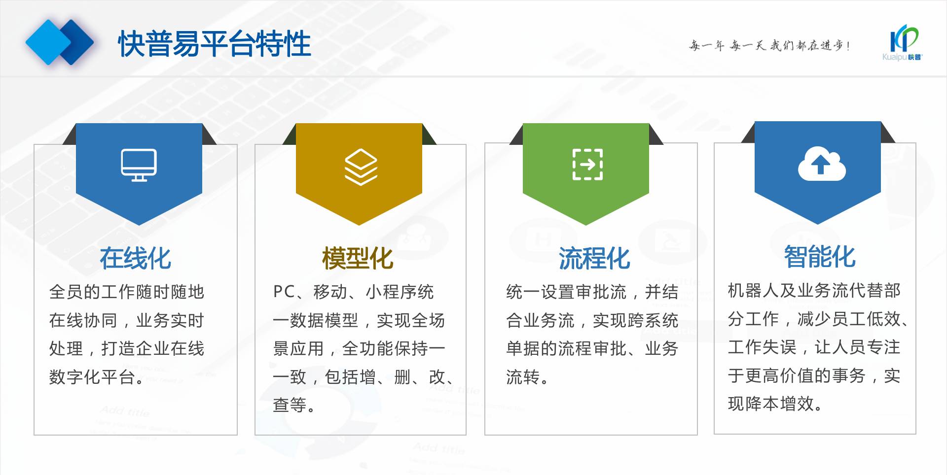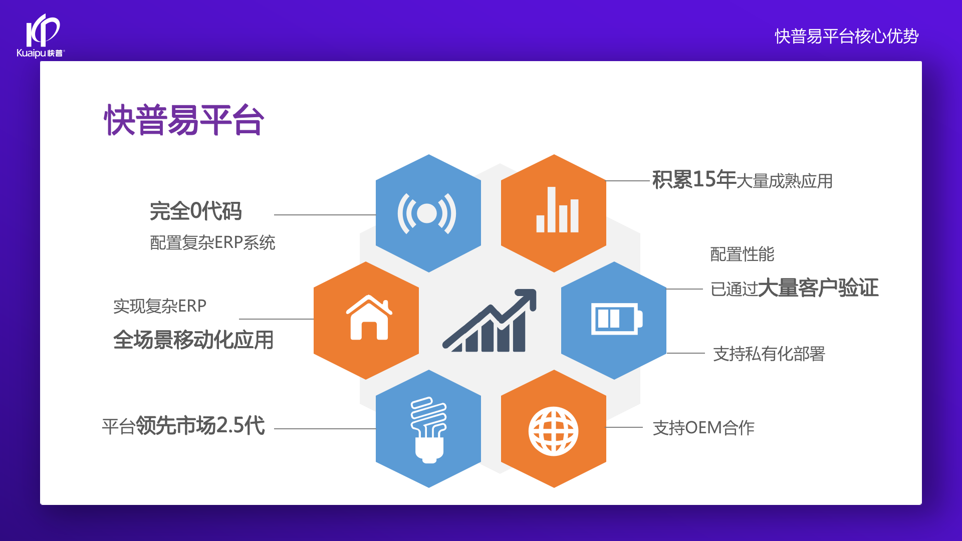 為了解決市場(chǎng)需求與平臺(tái)產(chǎn)品瓶頸等矛盾,實(shí)現(xiàn)徹底的零代碼平臺(tái),快普?qǐng)?jiān)持理念創(chuàng)新,以理念推動(dòng)平臺(tái)技術(shù)的創(chuàng)新?!耙圆蛔儜?yīng)萬(wàn)變”的理念:分析哪些東西未來(lái)肯定不變?哪些趨勢(shì)未來(lái)一定會(huì)變?從變化中找出不變的因素,從不變中找出變動(dòng)的因素;從量變到質(zhì)變,經(jīng)歷萬(wàn)變總結(jié)抽象出不變的本質(zhì)。基于快普長(zhǎng)期的信息化服務(wù)經(jīng)驗(yàn),開發(fā)配置出企業(yè)數(shù)字化轉(zhuǎn)型工具:快普易平臺(tái)成功解決了企業(yè)數(shù)字化轉(zhuǎn)型升級(jí)面臨的客戶大量個(gè)性化需求,真正實(shí)現(xiàn)隨需而變的設(shè)計(jì)理念,大大降低了信息化投入成本,提高信息化效率,幫助企業(yè)實(shí)現(xiàn)自主可控的技術(shù)創(chuàng)新,從而進(jìn)一步推動(dòng)企業(yè)的業(yè)務(wù)創(chuàng)新和管理創(chuàng)新。