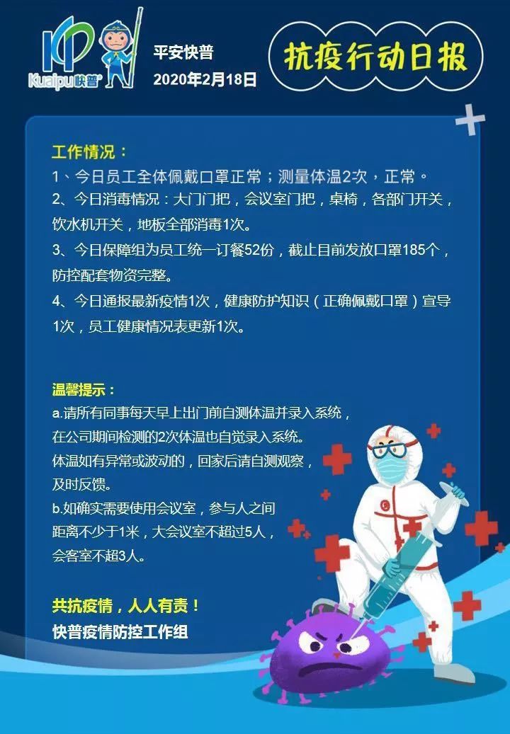 正式復(fù)工一周以來(lái),快普全力與新冠作戰(zhàn),相信在全員的努力下,平安快普將持續(xù)安全、有序的開(kāi)展工作,實(shí)現(xiàn)生產(chǎn)與防疫兩不誤!