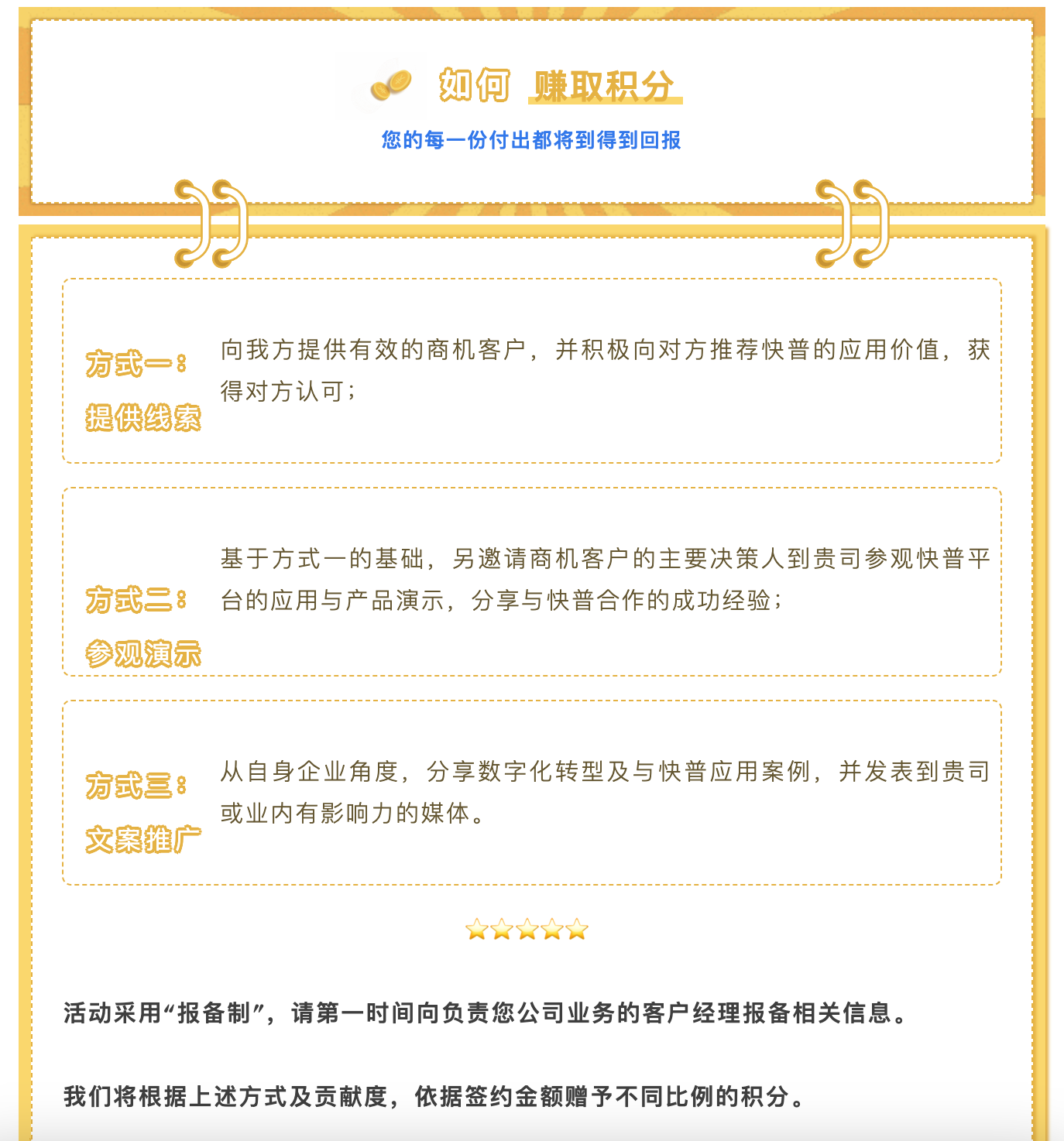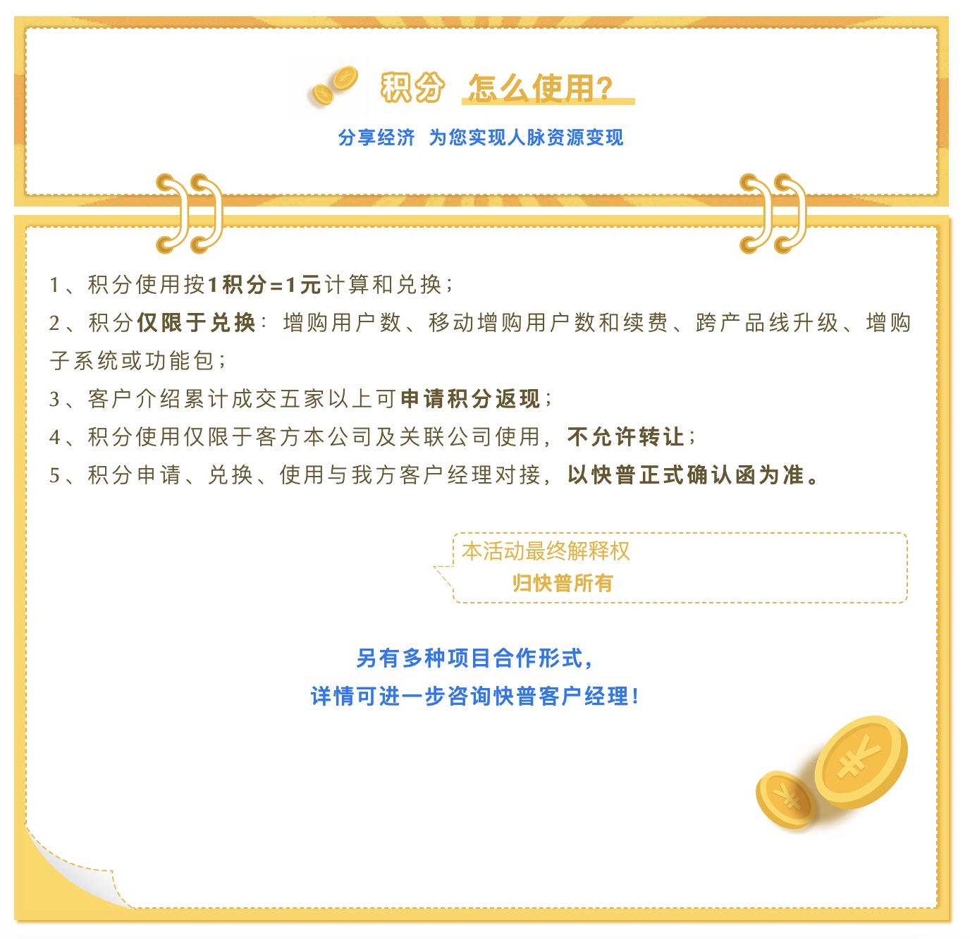 為進(jìn)一步回饋老用戶的貢獻(xiàn),現(xiàn)誠邀您參與“快普感恩回饋大行動!”,與我們共享數(shù)字經(jīng)濟(jì)發(fā)展的紅利!通過主動推薦、轉(zhuǎn)介紹客戶,您將獲取豐厚的積分返利,讓您的每一份付出都得到實(shí)質(zhì)性的回報(bào),人脈資源也可以獲得變現(xiàn)!